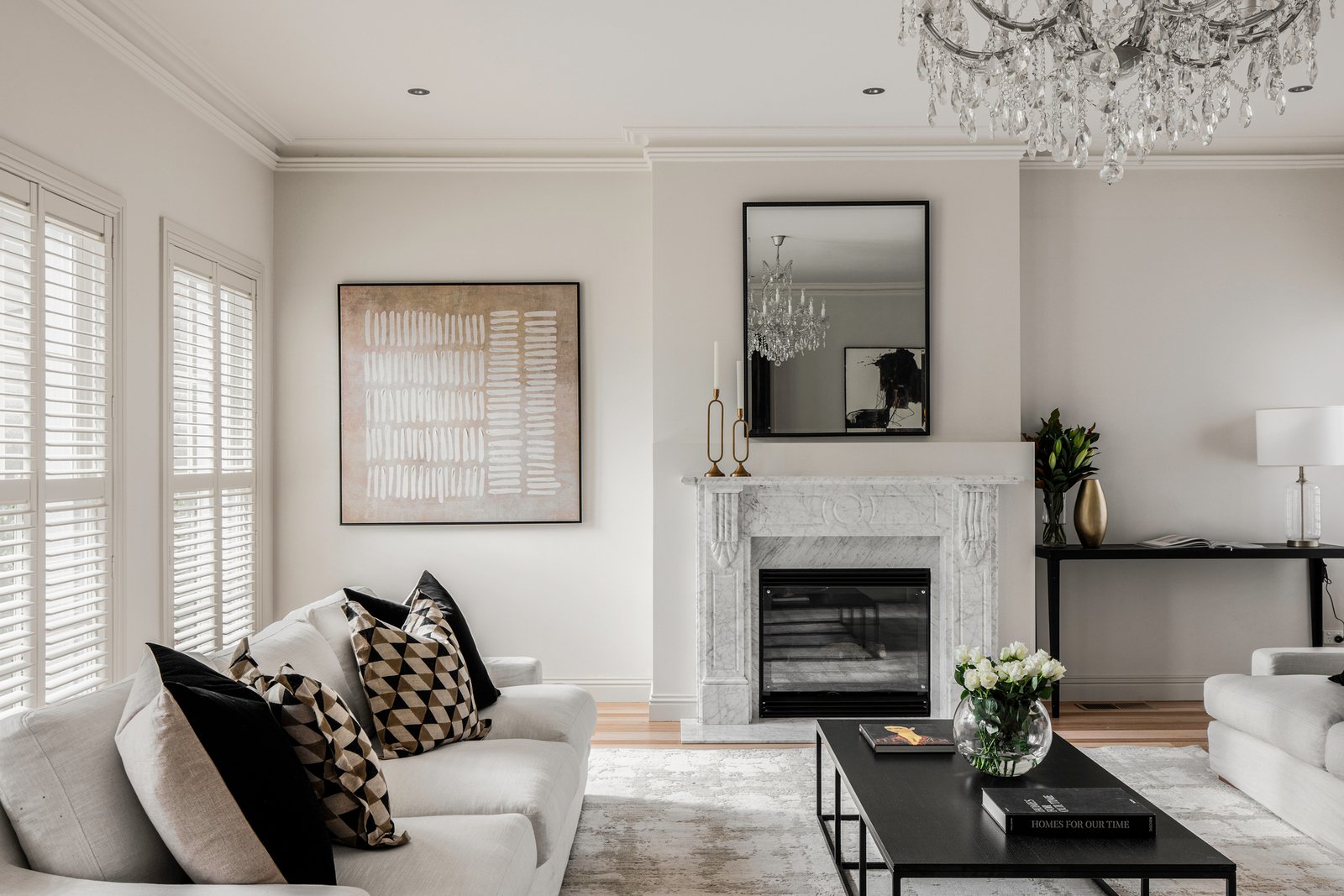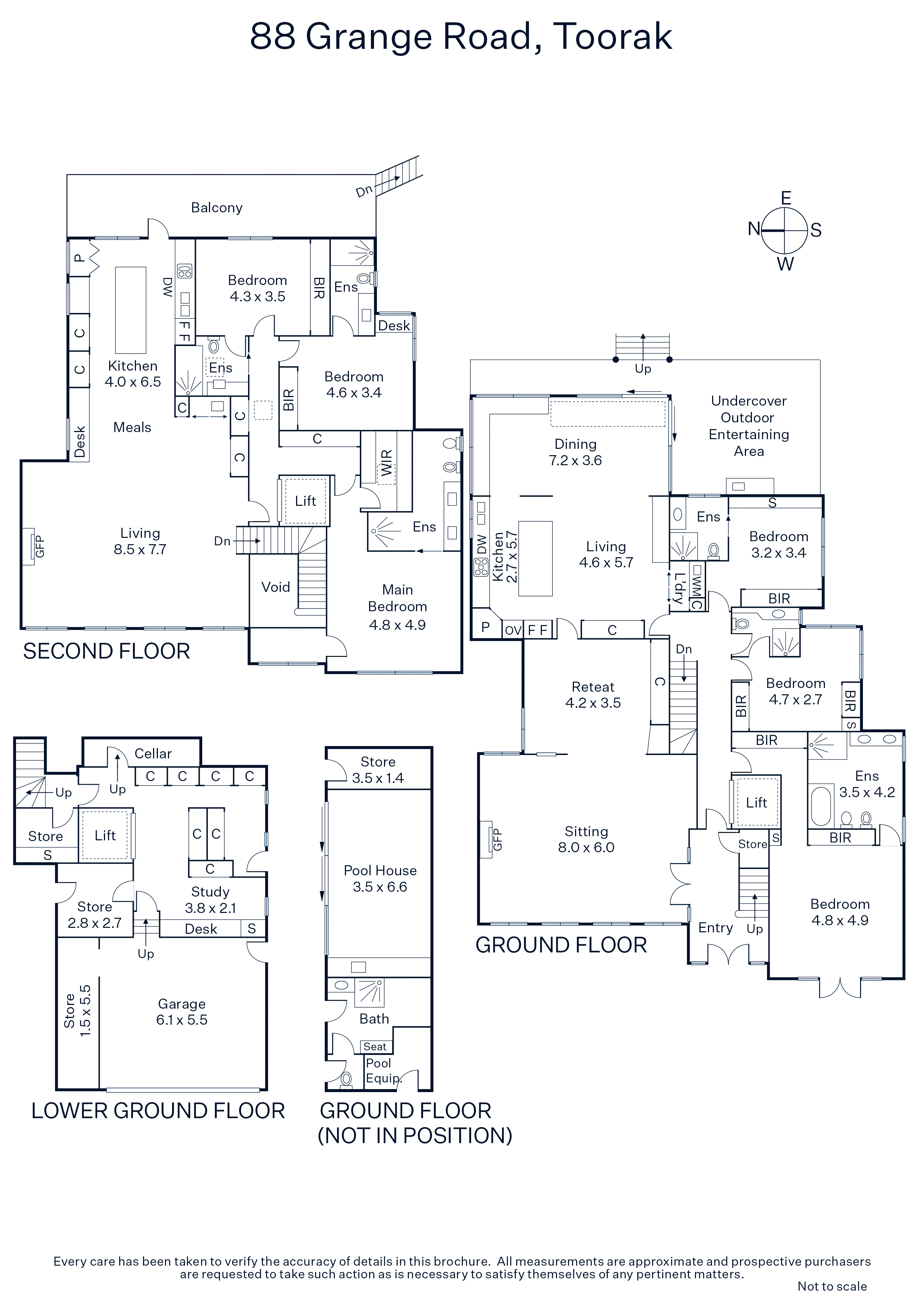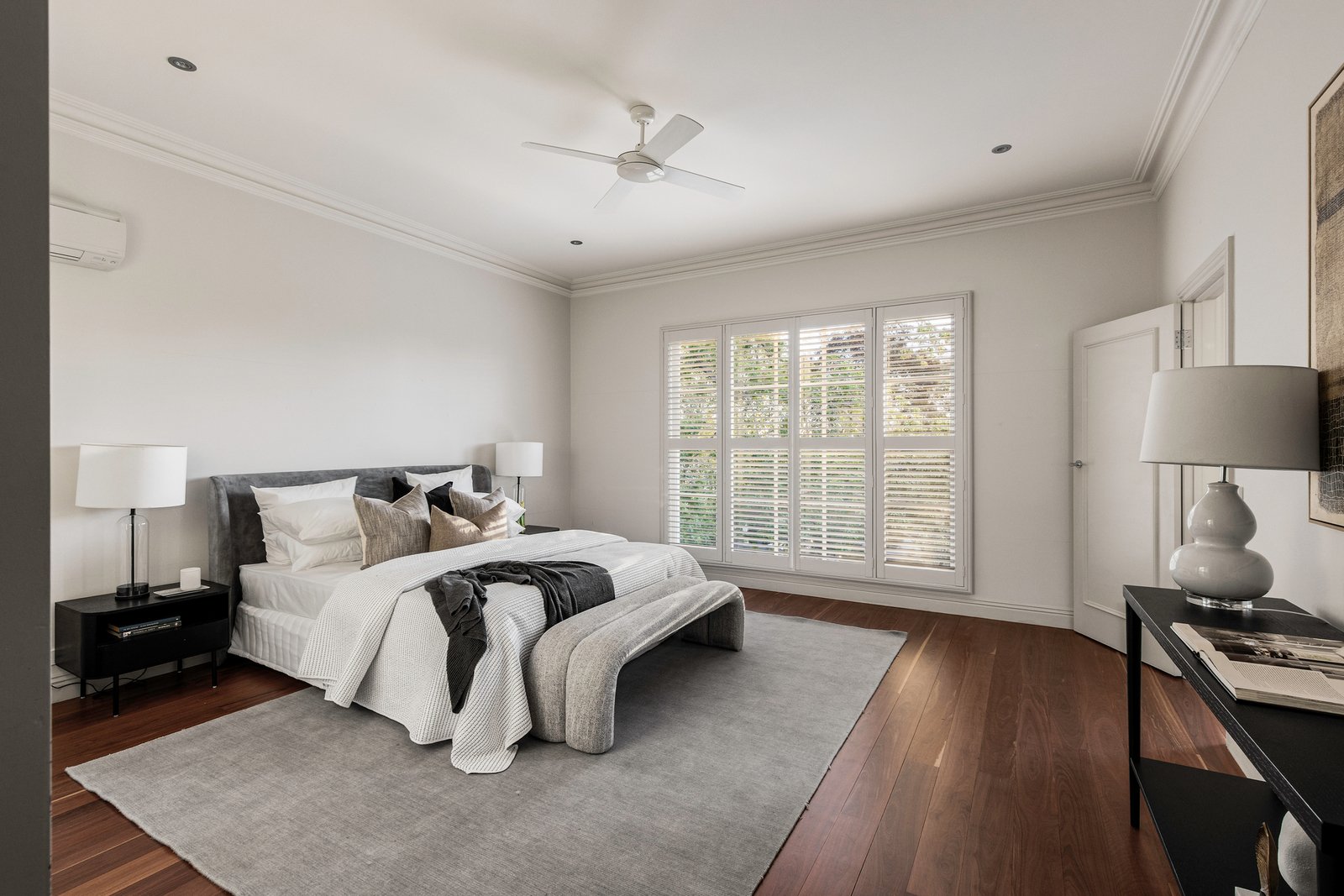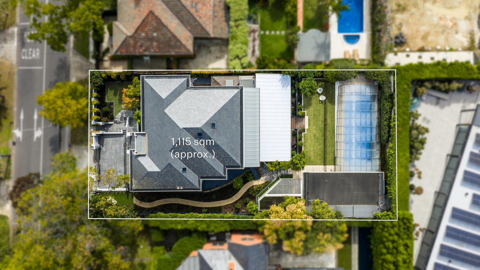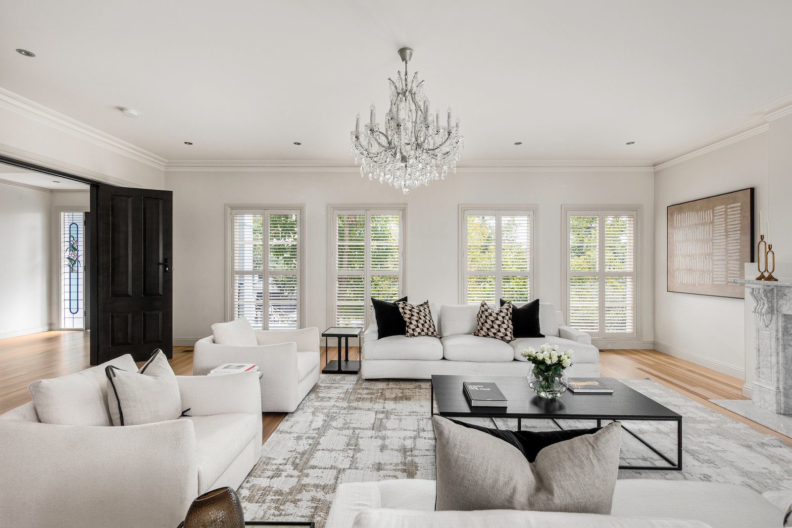 The generous entrance foyer introduces a grand scale formal sitting room with marble gas log fire and an adjacent media/TV room. Timber floors flow through the expansive living room and equally spacious sun-drenched dining domain served by a gourmet kitchen appointed with stone benches and a full suite of Miele appliances including a steam oven. The living spaces extend out to a large undercover deck ideal for al fresco dining. Beyond, the deep private northeast garden features a covered heated pool for year-round use and a pool house with kitchenette and bathroom. A light-filled double bedroom with balcony, marble ensuite and built in robes is accompanied by two additional robed bedrooms both with marble ensuites.