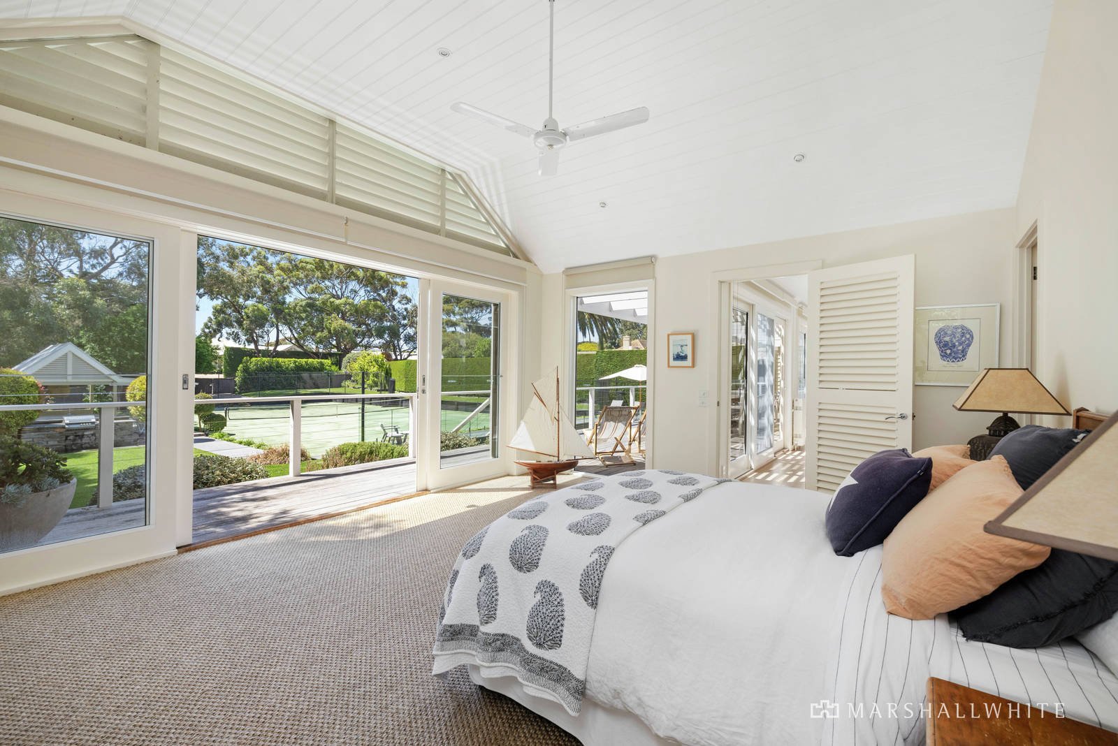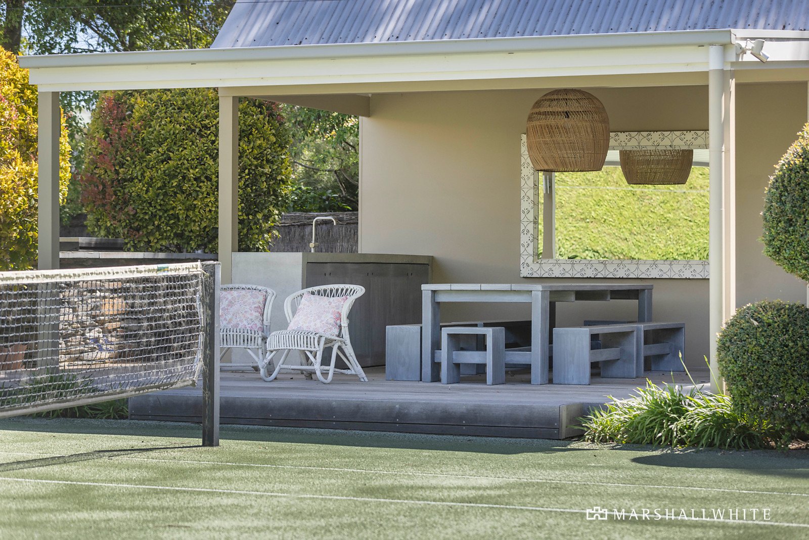 Accessible from both Sahara Court and Wimbledon Court, the property features 5 spacious bedrooms adorned with woven sisal carpet, 3 bathrooms, 2 car garage, and its own championship size tennis court and cabana for relaxation and entertainment. Sliding doors in the master bedroom, lounge, kitchen and living room open to a north-facing entertaining deck and sparkling pool, allowing you to enjoy the outdoors in style. The interiors are bathed in natural light, thanks to high ceilings, large windows, and skylights down the main hall. Stay comfortable year-round with hydronic heating, ceiling fans, and cosy open fireplace in the lounge. The kitchen features a large L-shaped island bench with stone top, gas cooktop, and premium Miele appliances.