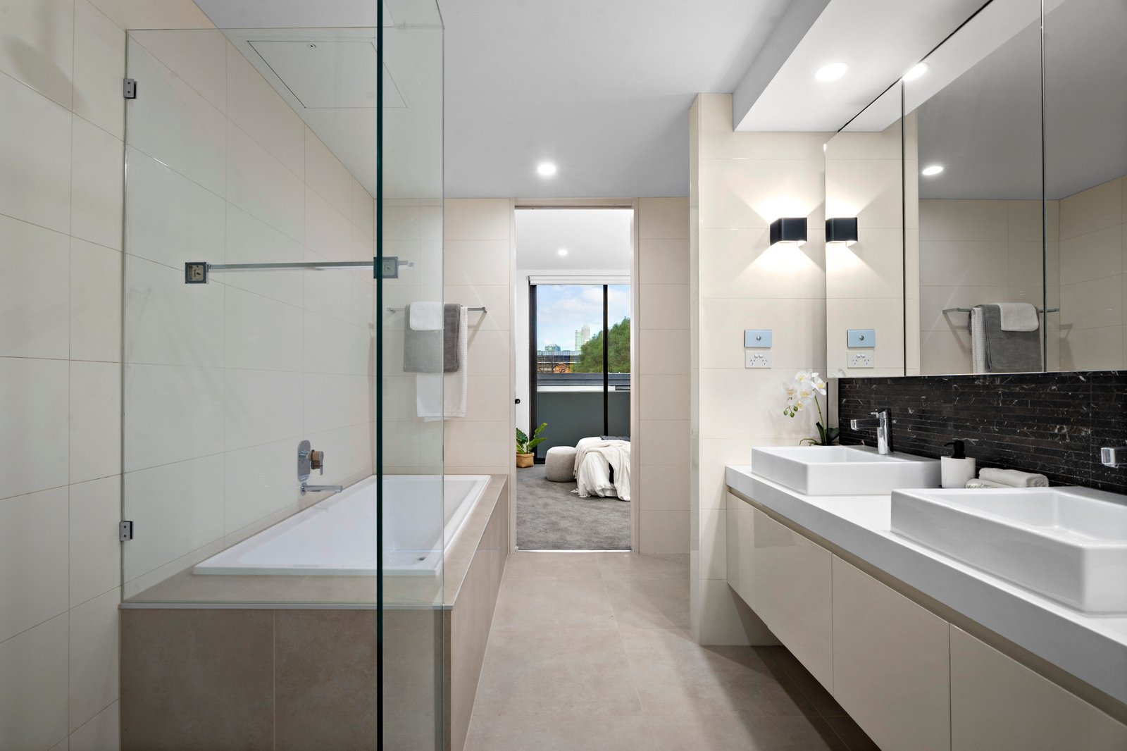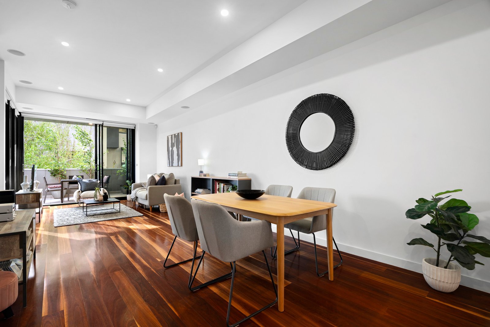 Over three levels, the layout unfolds with thoughtful design and brilliant natural light, comprising a choice of two main suites, each with an en suite and built-in robes. One suite is situated on the ground floor, and the other is upstairs, extending to a city-view balcony, whilst a third bedroom shares the top-floor semi-ensuite bathroom, which is chic with its hotel-like finish and twin shower. Central to it all, the substantial open-plan living and dining areas stretch across the first floor, drawing sunlight through full-height glass and linking to a terrace surrounded by established birch trees. Spotted gum flooring and high ceilings add to the striking aesthetic, complemented by a sleek kitchen equipped with Miele appliances, a large breakfast bar, and ample storage.